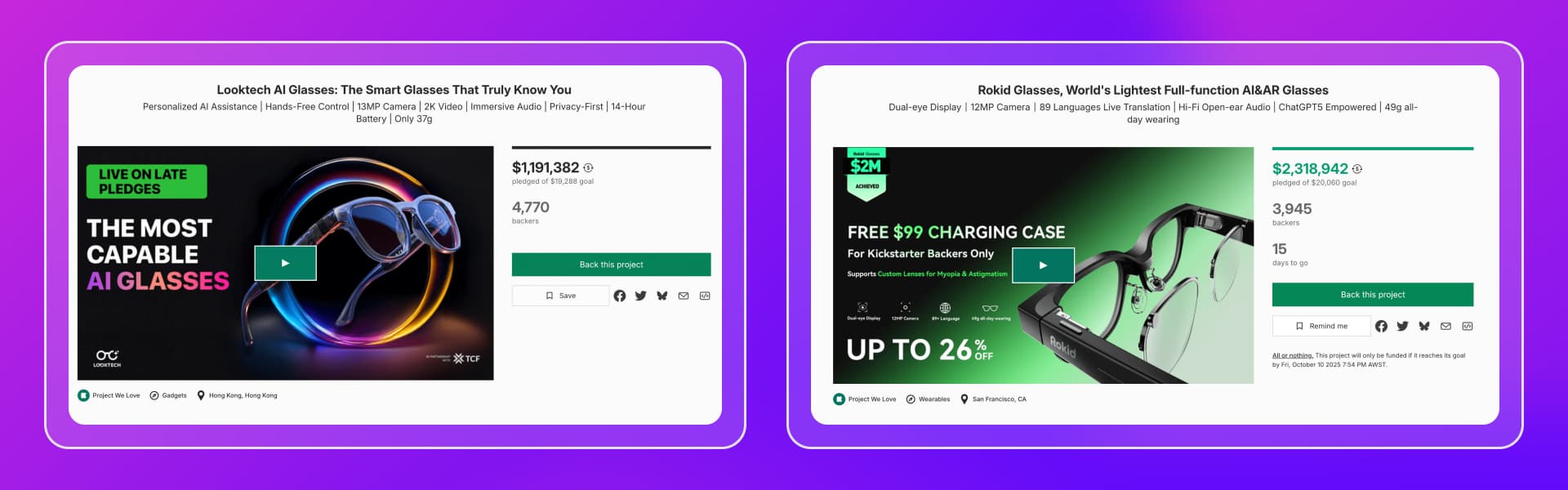 Founders looking to launch AI wearables can take inspiration from successful crowdfunding campaigns in this space. Rokid Glasses raised over $2 million on Kickstarter by emphasizing lightweight design, dual-eye displays, and real-world applications. Similarly, Looktech AI Glasses raised over $1.17 million with a focus on hands-free AI assistance and practical use cases.